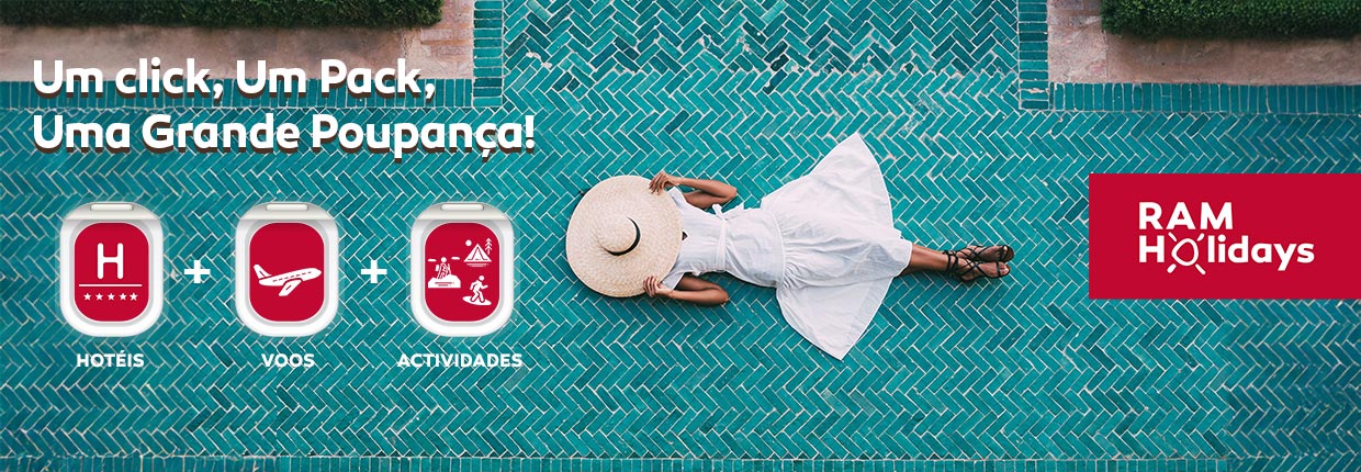 A RAM Holidays oferece tarifas privadas e não publicadas para destinos em todo o mundo. Aproveite as nossas melhores tarifas e poupe em voos e hotéis ao reservar a sua viagem na totalidade. Personalize o pacote de férias dos seus sonhos adicionando atividades.
