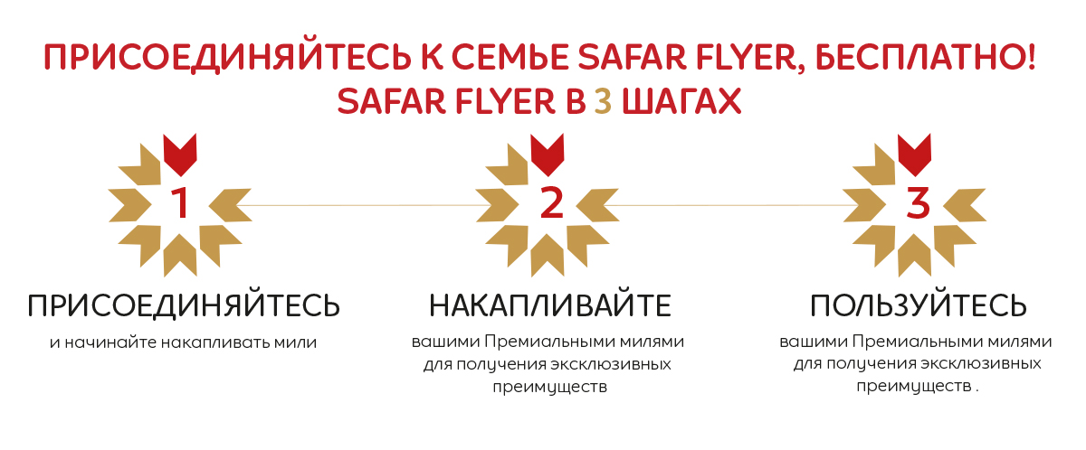 Членство в программе Safar Flyer бесплатно. Программа доступна для физических лиц в возрасте от 2 лет. Если применимо, несовершенным лицам требуется разрешение родителей или попечительство. В программе не могут участвовать юридические лица и группы лиц. Сотрудники, менеджеры любых авиакомпаний, туристических агентств, туристических операторов не могут воспользоваться преимуществами программы Safar Flyer.